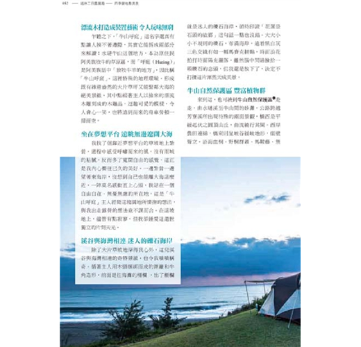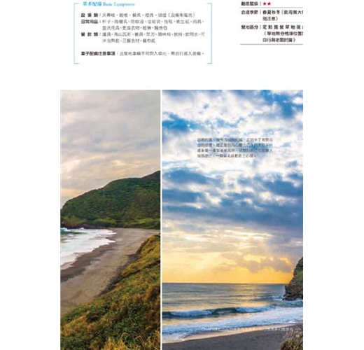 有別於一般書籍,我們還設計了可以手機掃瞄直接定位的QR code,以及現場實錄的影片,讓讀者搶先體會露營的美妙。仰臥沙灘聽濤等著看日出、待落日餘暉整片被染紅的天空,夜晚搭起營火與夥伴們細數星星,享受著與大自然間的協和共鳴,露營的美麗,真的要親身感受才是王道,趕緊收拾行囊,出發吧!