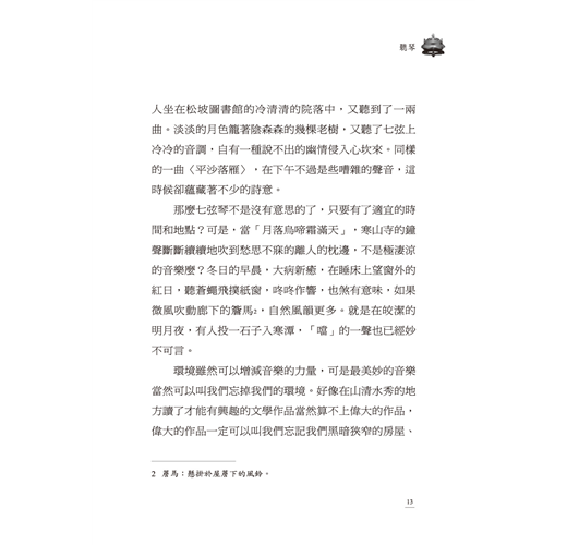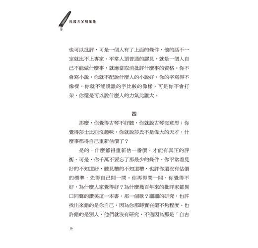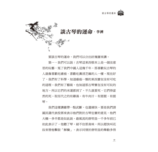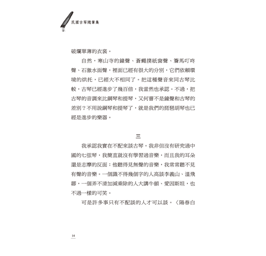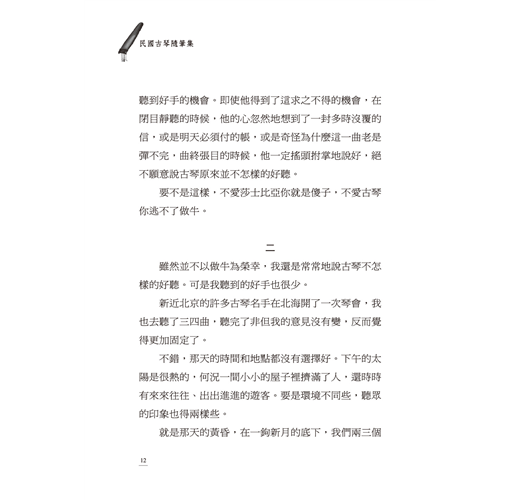 值得一提的是,本書的文章不是簡單的敘述,在抒寫中還帶有作者對古琴的整理和審視姿態,以陳西瀅始,以知堂終,讀者能夠從中體會被傳統文化一向視為國粹的古琴的命運。