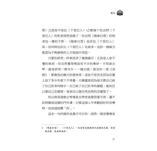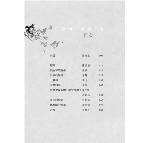 本書收錄文章凡十一篇,記述人事,論說琴樂,出入今昔,參差可喜。由於散落各處,絕大多數未為古琴愛好者及研究者所知。一個多甲子過去,人事代謝,往來古今,琴苑一角的剪影定格在這本小冊子裡,留待後輩,次第登臨。