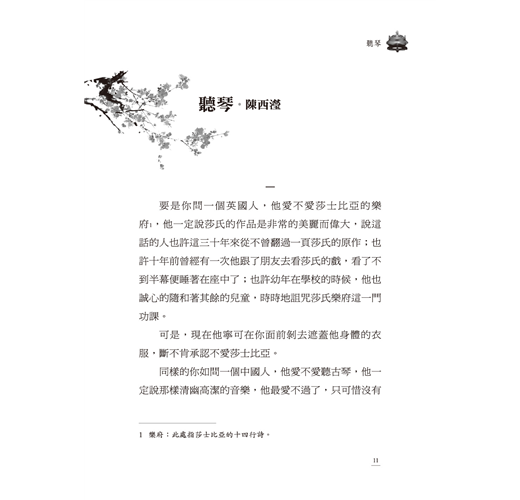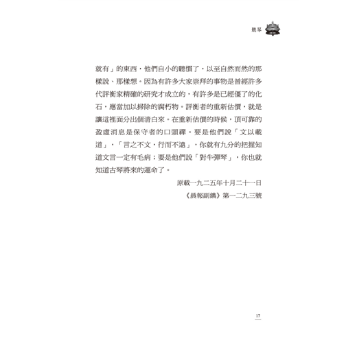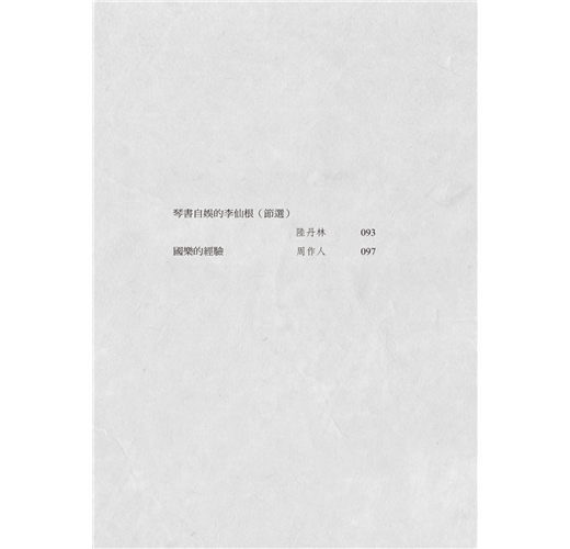 本書輯錄文章的年限是民國,卻有一個小小的例外——最末一篇〈國樂的經驗〉,發表於新中國肇始將近一周年的光景。知堂的文章當然絕佳,硬要以此為破例之由亦無不可。但仍需說明的是,這篇短文,事情是舊的、「經驗」是舊的、氣息也是舊的,更妙者竟與陳、李的話題遙相呼應。知堂大約不會喜歡陳西瀅這些「大人先生」,談起古琴倒有幾分契合,不同者在於知堂不動聲色,而陳西瀅富於英倫隨筆的瀟灑派頭。古琴在主流文化中素來倍受尊崇,近代以降卻如此時運不濟。小集子以陳西瀅始,以知堂終,其間的曲折山水、幽明襟抱,豈不令人感慨遙深。再過得幾年,鄧拓寫〈聽琴記〉,已全然是另一番筆墨了。故知堂的文章雖略過時限,於體例亦未嘗多違也。