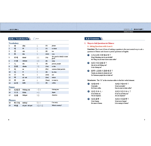 This six-volume series is a comprehensive learning material that focuses on spoken language in the first three volumes and written language in the latter three volumes. Volume One aims to strengthen daily conversation and applications; Volume Two contains short essays as supplementary readings; Volume Three introduces beginning-level written language and discourse, in addition to extended dialogues. Volume Four uses discourse to solidify the learner’s written language and ability in reading authentic materials; Volumes Five and Six are arranged in topics such as society, technology, economics, politics, culture, and environment to help the learner expand their language utilisations in different domains.