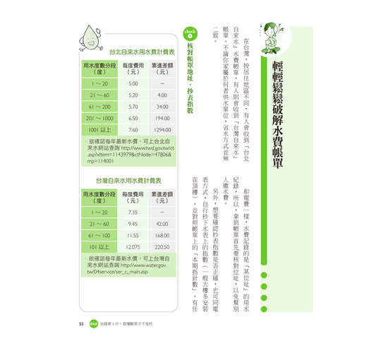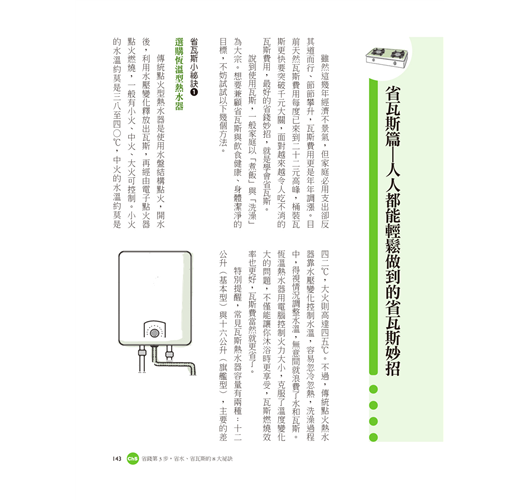 想要省錢過生活,光省電還不夠,省水、省瓦斯同樣很重要!雖然和電費相比,水費、瓦斯費只是小兒科,但經年累積下來,也是一筆不小的花費,加上台灣年年鬧水荒,與越來越令人吃不消的瓦斯費用,站在節約能源的立場,學會如何省水、省瓦斯,更是每個人都不能輕忽的問題。本書作者獨家傳授省水、省瓦斯祕訣,讓你省得更有感: