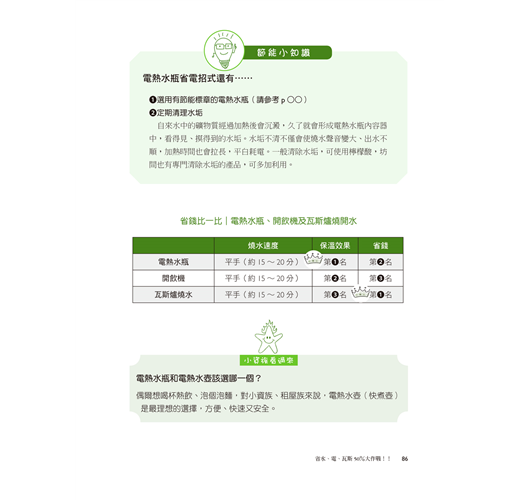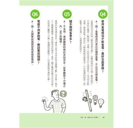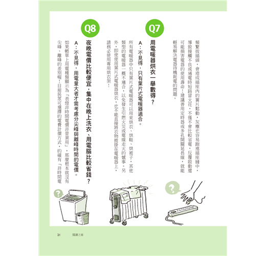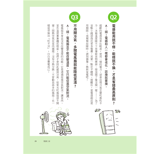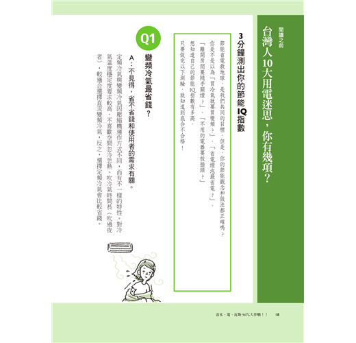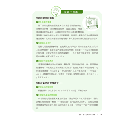 本書作者特別詳列台灣20大生活常用電器省電妙招,並將常用電器分成4大類:(1)耗電量驚人的超級吃電怪獸,例如冷氣、電燈;(2)耗電量大但不易察覺的隱藏版吃電怪獸,例如吹風機、電暖器;(3)因應氣候變化使用的特別版吃電怪獸,例如烘衣機、電熱水器,以及(4)只要善用,就能幫我們省更多的能省就省小幫手,例如電風扇、除濕機,並提供你立刻就能做到的省電技巧: