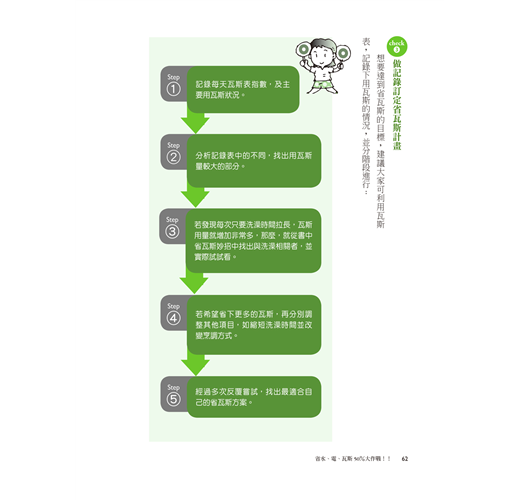 除了上述省錢妙招外,本書還提供「小資族省電省錢小撇步」,像是以電毯取代電暖器、單門冰箱關閉冷凍庫、洗衣次數少者,建議手洗+投幣式洗衣……等,以及經過節能專家實際測試的「各類家電機型大PK」,例如直立式VS.滾筒式洗衣機、石英管VS.陶瓷式VS.葉片式電暖器、電熱水器VS.瓦斯熱水器……等的耗電量與優缺點比較,讓你變身選購達人,並提供水、電、瓦斯DIY表格,幫你揪出錯誤的用電習慣,省到最高點,拯救你的荷包!