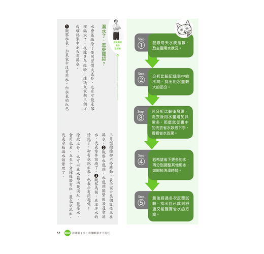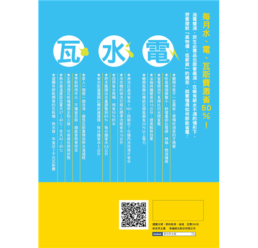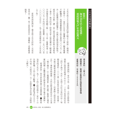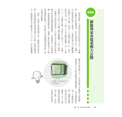 另外,本書特別加碼「企業、店家不可不知的省電祕訣」,幫老闆們精打細算每一塊錢,例如:非時間電價VS.時間電價方案建議;如何制定最適合的經常契約、非夏月契月、周六半尖峰契約、離峰契約;提供商家節電建議,像是餐飲業加裝空氣簾或自動門,可省電8000元……等,最後還無私分享居家、店家和社區省電案例,是一本適合每個人的DIY節能小百科。