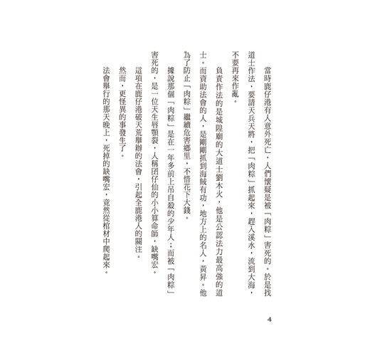 據說那個「肉粽」是在一年多前上吊自殺的少年人;而被「肉粽」害死的,是一位天生唇額裂,人稱囝仔仙的小小算命師,缺嘴宏。