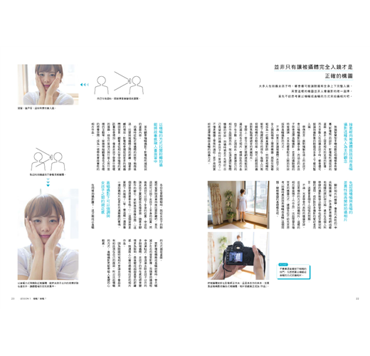 入鏡範圍╱將自己感興趣的被攝體安排在正中央╱構圖時極力避免多餘的被攝體入鏡╱用筆直的構圖拍攝筆直的被攝體╱以1:1(對稱式)比例安排美麗相片構圖╱讓人像線條和輪廓美麗呈現╱藉由圖形化、幾何式的構圖讓動作變得更醒目╱相異中帶有著相似感空隙與留白╱從欣賞作品中學習各式各樣構圖
