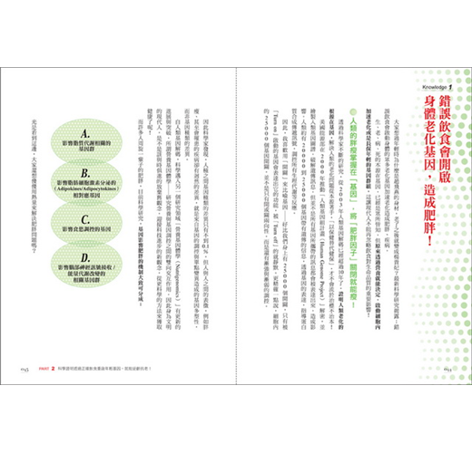 【激瘦特點2】「科學背書」!→→本書研究以國際期刊為本,教你啟動讓身體輕盈的基因!眾說紛紜的錯誤減肥法,只會讓身體越減越糟!本書以科學實證為依據,將最新的基因工程研究,簡化為容易在餐桌上實踐的減肥飲食法,強調「均衡營養、吃七分飽」就能啟動年輕基因,讓身體輕盈!