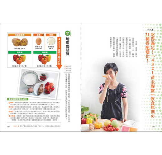 【激瘦特點3】「不必禁食」!→→三餐飢餓度日,不如吃對食物比例,保證瘦得漂亮又健康!減肥就怕吃不飽、餓了反而想吃更多!「4321黃金餐盤」飲食原則」主張三餐吃進4大類食物,並強調吃的比例,照著做,就能提供身體足夠的營養素,不會挨餓、不會嘴饞,就能輕鬆養出「瘦子體質」!