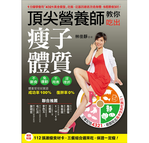 這次,很榮幸可以幫佳靜老師的新書《頂尖營養師教你吃出瘦子體質》寫見證序。起初,我只想把自家實驗「4321黃金餐盤」飲食原則的過程和效果讓給佳靜老師知道,沒想到她正撰寫新書,於是我就將全家人「變身」的資料整理一遍,發現過去苦纏好幾十年的贅肉,老師的方法竟讓在幾個月內全都殲滅了!我常說老師是小龍女,她收留了我們這些到處苦尋減肥方法的人,並教會我們一套終生「瘦」用的武功,不用一顆減肥藥,就能安全健康的減肥成功!