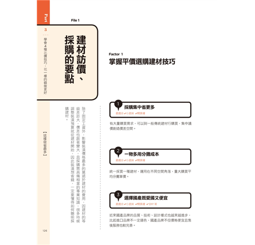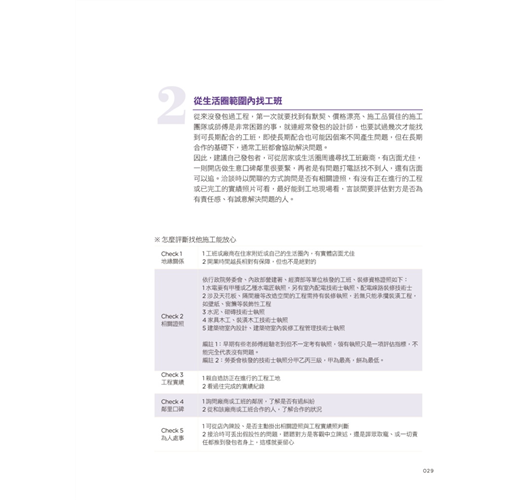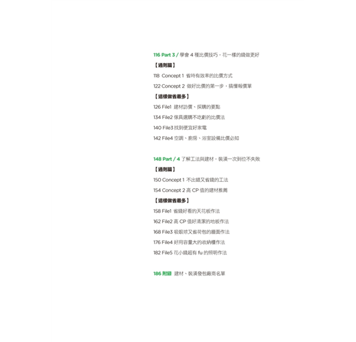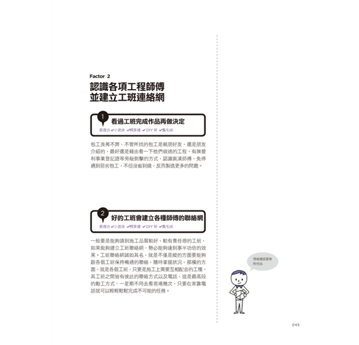 以發包者詢問度最高的問題起頭,針對該問題進行詳答。省去繁複敘事,只針對發包最易卡關的四大面向——統籌規劃、時程管理、工法&建材知識、比價技巧做說明,一目了然,查找容易。