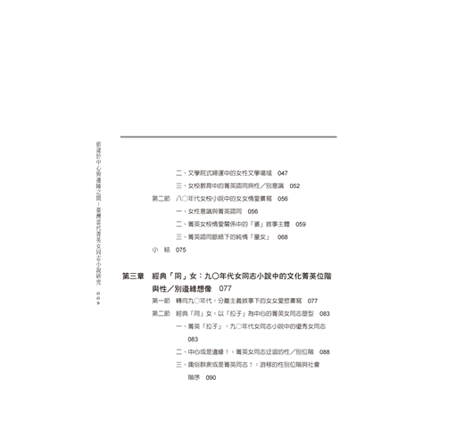 本書探討臺灣當代女同志因性別認同與文化階層的差異,所形成的菁英/邊緣位置游移現象。以九○年代劇烈變動的氛圍中,十分具有「典型」菁英女同志意義的已故作家邱妙津的小說為主,並以其他同時期的女同志文本,例如林黛嫚、張亦絢、杜修蘭、曹麗娟等其他作家的作品為輔,論述女同志小說中的菁英氣質,及菁英女同志不同於社會學研究中所關注的T吧階級女同志的既中心又邊緣的性/別位置與文化位階,並思索這種依違於邊緣與中心的文化位階,其中所呈顯出來的菁英認同與邊緣想像,如何延續並深化性/別位階與愛慾身體的複雜糾結。