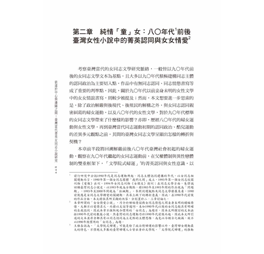 從朱天心時代有情無欲的「春風蝴蝶女子」,到堅持女生與女生不能做愛的「童女」,乃至於悲壯激烈愛欲無能的「拉子」,女同志文學的情欲書寫都顯然難以離開「柏拉圖」式的精神世界,乃至於將純愛/性愛、精神/現實、菁英/庸人等牢牢對立?而菁英女同志因其無法於公領域中現身的同性情欲,在自我性向無以現身的生活日常之中,是否可能更將自限於個人私密空間?甚且,當菁英女同志以知識、學歷換取情欲自主的籌碼的同時,自原鄉、母國出走,身處於提供相當匿名性的城市中,在常見的異鄉/異國的情欲自主書寫之中,又將與其同志之身的私密性疊合產生如何的空間經驗?而如此菁英品味(「純」愛/「純」文學)式的女同志文化再現,對於往後臺灣的女同志文學與文化走向,又可能會有怎樣的影響?兩千年後,臺灣的女同志文學書寫較之九○年代以前,又呈現出怎樣的承接與轉折?