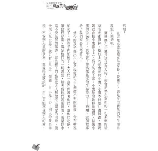 鷹媽媽在小鷹長到足夠大時,便會把墊在窩裡的一切柔軟的稻草羽毛都掀掉。樹枝上的刺會刺痛小鷹,小鷹本能地往邊緣蹭,鷹媽媽就會把小鷹推下去。為了防止下落,小鷹拚命地揮動翅膀,結果小鷹的命保住了,也學會了作為鷹基本的生存能力──飛翔。這個故事給了我們家長很多啟示。