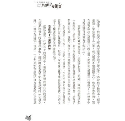 這就是說,在愛孩子的過程中,要能自覺地控制自己的感情,克制那些過多的激情和衝動。前蘇聯著名教育家馬卡連柯的《父母必讀》一書中有這樣一段話:「子女固然會由於父母方面愛的不足而感受痛苦,可是,他們也會由於那種過分洋溢的偉大的感覺而腐化墮落。理智應當成為家庭教育中常備的節制器,否則孩子們就要在父母最好的動機下,養成了最壞的特點和行為了。」這段話講得十分深刻。