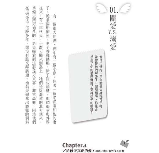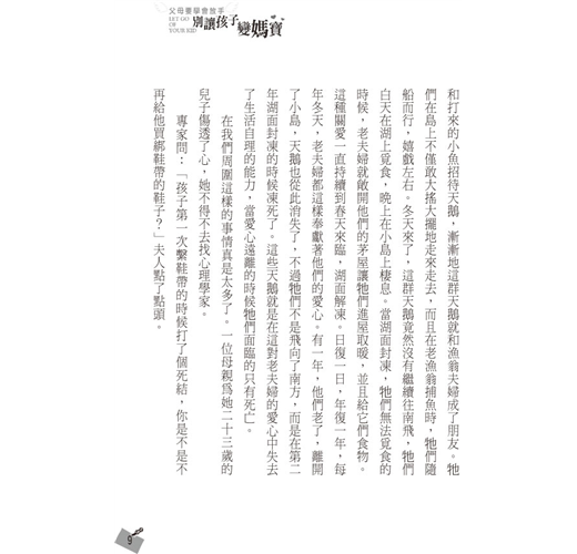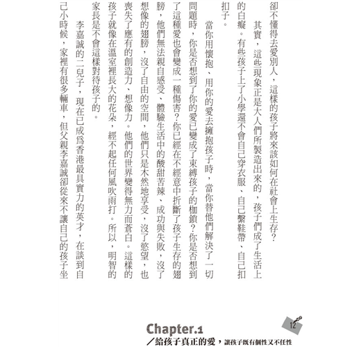 當你用懷抱、用你的愛去擁抱孩子時,當你替他們解決了一切問題時,你是否想到了你的愛已變成了束縛孩子的枷鎖?你是否想到了這種愛也會變成一種傷害?你已經在不經意中折斷了孩子生存的翅膀,他們無法親自感受、體驗生活中的酸甜苦辣、成功與失敗,沒了想像的翅膀,沒了自由的空間,他們只是木然地享受,沒了慾望,也喪失了應有的創造力、想像力。他們的世界變得無力而蒼白。這樣的孩子就像在溫室裡長大的花朵,經不起任何風吹雨打。所以,明智的家長是不會這樣對待孩子的。