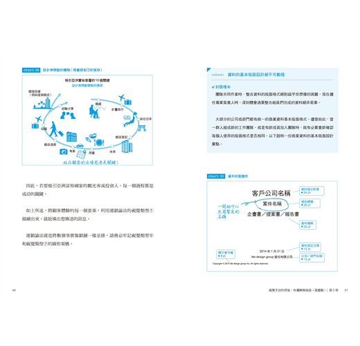 第1章首先說明「資料製作藍圖」的整體概念,包括「視覺」、「邏輯」、「產出」和「溝通」4個步驟。決定資料的視覺類型後,再依據邏輯輸入內容,一步步完成資料,並透過溝通,掌握客戶的心理和想法。這就是資料製作術的整體概念。