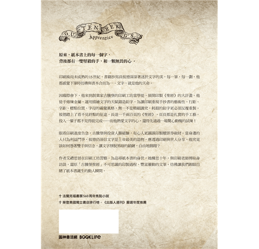 充滿想像力!即使故事舞台是15世紀,反映的議題卻與今日息息相關。如果你對瞬息萬變的出版藝術感到興趣,這是一本必讀之書。(BookPage書評)