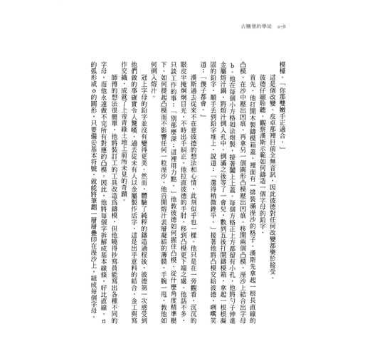 五年來,我訪問了多位研究傳統印刷術的學者,研讀堆積如山的相關書籍。追尋過程令人十分興奮,我慢慢了解,關於古騰堡的研究近年出現了革命性的詮釋,學者放棄「古騰堡一人天才」的推論,綜觀全局,還原了一切的關鍵:古騰堡、投資人法斯特和學徒彼德三人在破舊印刷工坊研發,模式宛如今日的車庫創業,而這門技術最終影響了現代世界。