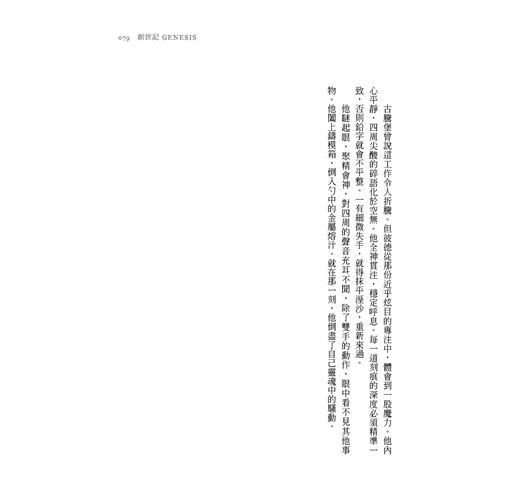 2009年的七月,印刷史權威學者保羅.尼達姆輕描淡寫地將一本「古騰堡聖經」複本放入我手中,那是寫作過程中最美好的一刻。這部印刷書籍的工藝水準令人驚豔,墨跡濃密,彷彿前一天剛剛印好。我在一頁頁巨大的版面上,感受到那些職人的精神在流動。身為印刷師,我將手指拂過牛皮紙頁的字母印痕。身為作家,我希望自己能述說這個不凡的故事,藉此在我們疏離、電子化的時代中,重新肯定紙本書的價值。