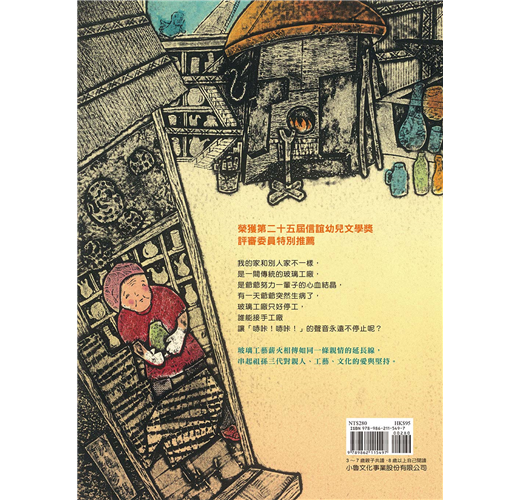 本書作者以版畫技法突顯傳統玻璃工廠古樸懷舊的氛圍,與玻璃晶瑩剔透的質地形成強烈對比,期望讀者不只看見故事的意涵,也能感受她獨特的創作和巧思。