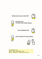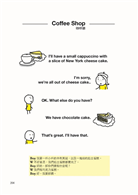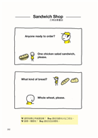 不同於一般語言書只會列出符合文法且落落長的句子,好像一句話不用喘息就要把兩三件事情都講完,本書符合實際情境,在插圖旁配上只有幾個單字的英文,一場對話下來其實幾個簡單的單字就能溝通,連小學生都能懂,而且還附上可替換的表達方式,就算忘了「第三人稱單數動詞要加s」、「go的過去式是went」,各種狀況都搞定。