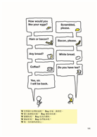 從踏進機場、進入機艙找座位,還是到餐廳用餐等等,作者用一小段的敘述,以朋友間對話般的口吻,告訴你遇到狀況時該怎麼做。至於在飛機上要上廁所時,怎樣判斷裡面是不是有人;公車時刻表上面會怎麼表示班次;飯店會有哪些床型,會有哪些服務;牛排除了「全熟」和「五分熟」之外,其他程度的講法怎麼說;在餐廳的點菜方式等等,都用圖解來告訴你。