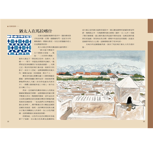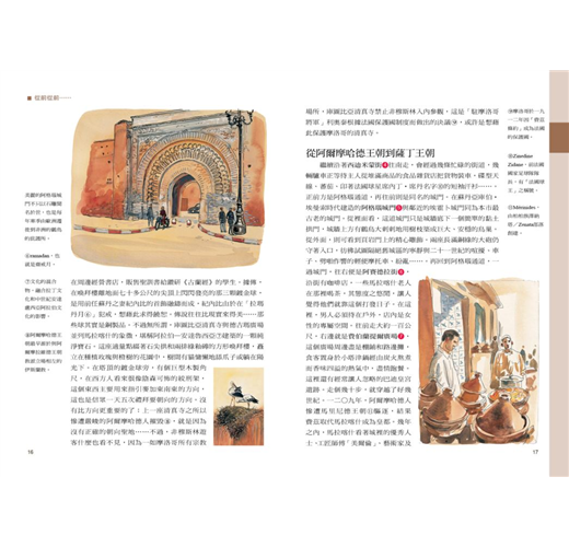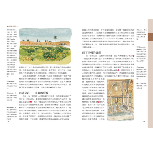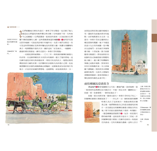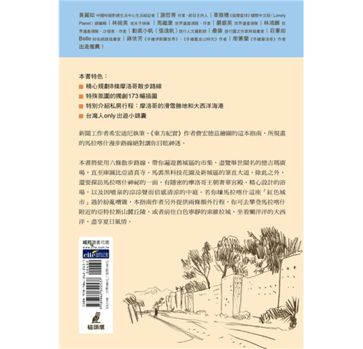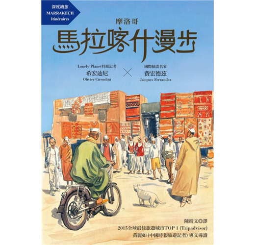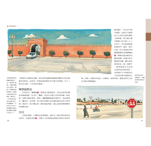 我是Lonely Planet指南的愛用者,但在馬拉喀什我很少把書拿出來,更很少翻閱書中的照片,因為眼前的風景非照片能捕捉的。但「深度繪旅」系列卻突破了照片的疆界,在《摩洛哥馬拉喀什漫步》中,繪圖者費宏德茲的線條讓馬拉喀什老城區的風光活了起來,在赭紅和線條間,呼應了那個城市的氣味,就像在老城區巷弄間牆上畫的箭頭,跟著神祕的指示,直觸馬拉喀什的核心。旅行歸來,翻閱此書,大廣場的擁擠、清真寺的朝拜、蝸牛的鮮美、羊肉的豐腴全部竄了出來,再一次跟著文字與插畫痛快迷走馬拉喀什。
