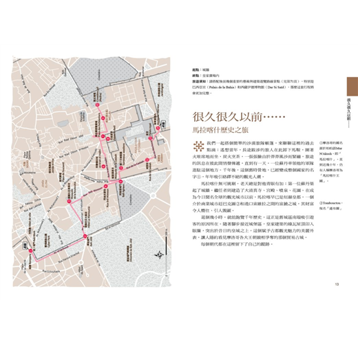 色彩鮮豔的水果攤、精細緻密的伊斯蘭織品、香味撲鼻的香料、清真寺喚拜樓廣播傳出的可蘭經、槌子敲擊銅製品的鏗鏘聲……由新聞工作者希宏迪尼執筆、《東方紀實》作者費宏德茲繪圖的這本指南,所規畫的馬拉喀什漫步路線絕對讓你目眩神迷。