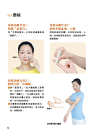 第4章 刮痧美容 皮膚乾燥 刮痧方法:刮拭手、足,保持皮膚滋潤 出現皺紋 眉眼間皺紋 刮痧方法:刮拭「心區」、「肺區」,為心肺補充營養 眼角魚尾紋 刮痧方法:刮拭頭部、臉部,加強膽經氣血 額頭皺紋 刮痧方法1:刮拭頭部、臉部 刮痧方法2:刮拭額頭及頸背部 毛孔粗大 刮拭方法1:直接改善局部氣血循環 刮拭方法2:刮拭胸腹部,補益肺氣、清大腸 刮拭方法3:刮拭背部、手臂,清熱利濕 雀斑 刮拭臉部:直接改善局部氣血循環 刮拭其他部位:進一步補益肺腎 肌膚鬆弛 刮拭臉部:補益大腸,用「提拉法」緊膚 刮拭其他部位:進一步增強脾胃功能 黃褐斑 刮痧方法1:在刮拭臉部的基礎上加強刮拭黃褐斑部位 刮痧方法2:刮拭臉部、背部、四肢
