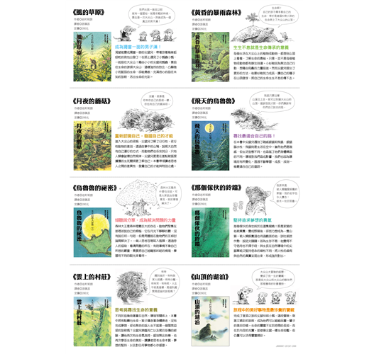 這一系列首先登場的四本好書:《風的草原》《黃昏的暴雨森林》《月夜的蘑菇》《飛天的烏魯魯》光從書名來看就讓我們充滿想像:書裡有草原,有森林,有長在地上夜裡的蘑菇還有會飛的烏魯魯,真是多采多姿,充滿自然的童趣。首先,最讓我驚豔的是每本作品的跨頁封面和封底,封面中央都有一隻小尖鼠,故事開始和結束的幾頁彩色圖頁也讓人愛不釋手,看了心情愉快;書中岩村和朗運用鉛筆畫黑白的插圖,搭配故事情節更是讓人讀著讀著發出會心一笑!