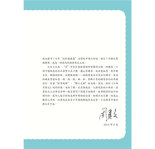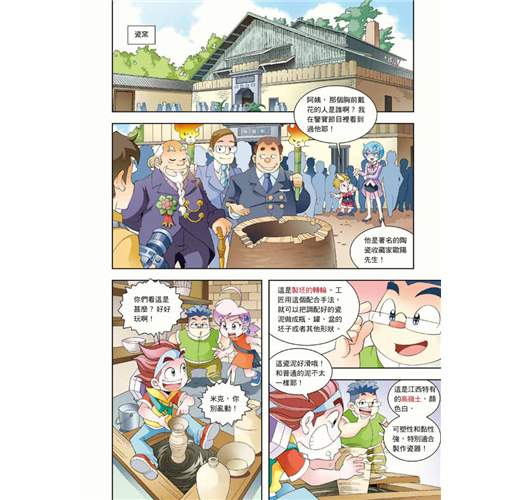 而自古以來,“貢”字往往象徵著極珍貴難得之物,細數來,江西可堪稱羨的名品著實不在少數。廬山雲霧茶、南昌瓷板畫、萬年縣貢米、鄱陽湖珍珠、南豐縣蜜橘……風物特產尚不算如何稀奇,省內的礦產資源如金、銀、銅、鎢、鈾、鉭、重稀土等的儲量皆位於全國前列,有著“世界鎢都”、“稀土之鄉”的美稱。因此,得知《江西尋寶記》的問世後,亟欲了解,在名物風流、人傑地靈的江西省,漫畫的主人公會追尋哪一樣至寶呢?閱罷不由頷首,故事劇情的設計的確巧妙,最令人想不到的是那件寶物的設置,的確不同凡響,結尾也頗耐人尋味。如果現在的青少年讀物都能有此品質,少兒圖書市場亦將大有可為。