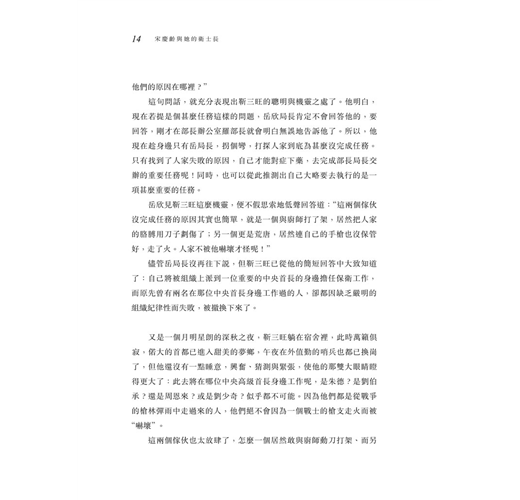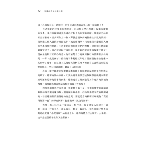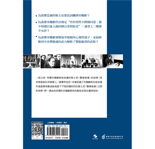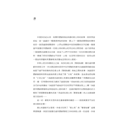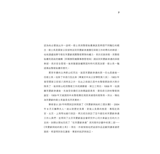 一直以來,有關宋慶齡與她身邊的衛士長(警衛秘書)的故事,因其眾說紛紜而被蒙上一層傳奇色彩。本書記錄了宋慶齡與在她身邊作過重要貢獻或給她留下不快回憶的四位衛士長(警衛秘書)之間的故事,將一個血肉俱豐的宋慶齡較為完整地呈現在讀者面前。
