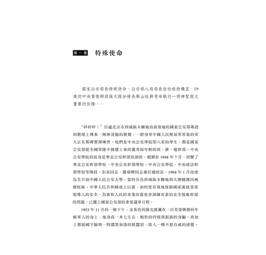 “砰砰砰!”位處北京市西城區木樨地培訓基地的國家公安部專設的靶場上傳來一陣陣清脆的槍聲,一群身穿中國人民解放軍軍裝的軍人正在那裡實彈練習。他們是中央公安學院第八系的學生,都是國家公安部從全國軍隊中挑選上來的優秀而年輕的班、排、連幹部。中央公安學院的前身是華北公安幹部培訓班,創辦於1948年7月,經歷了華北公安幹部學校、中央公安幹部學校、中央公安學院、中央政法幹部學校等階段。彭真同志、羅瑞卿同志兼任過校長。1984年1月改建為全日制中國人民公安大學。當時分為西城區木樨地與大興縣團河兩個校區。中華人民共和國成立以後,如何更有效地保衛國家黨政重要領導人的安全、為黨和人民的事業培養更多訓練有素的安全保衛幹部的問題,已擺上國家公安部的重要議事日程。
