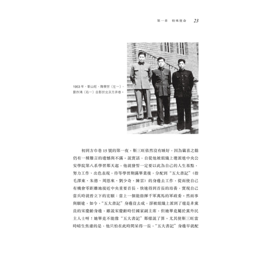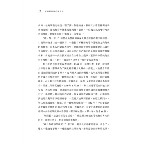 貫穿本書的主角靳山旺同志,就是宋慶齡身邊的第一任也是最後一任衛士長。他除了本是行伍出身(畢業於中央公安學院第八系)、1953年曾受國家公安部八局特派之外,在此之前就已是中央警衛師政保大隊分隊長了,後來靳山旺因警衛工作成績顯著,榮立三等功;1958年,他調離宋慶齡身邊後,先後受命擔任沈鈞儒副委員長、劉伯承元帥的警衛與副官;1959年又被調到中央警衛團任周恩來總理的衛隊長。所以,稱他為宋慶齡的衛士長當是名副其實的。