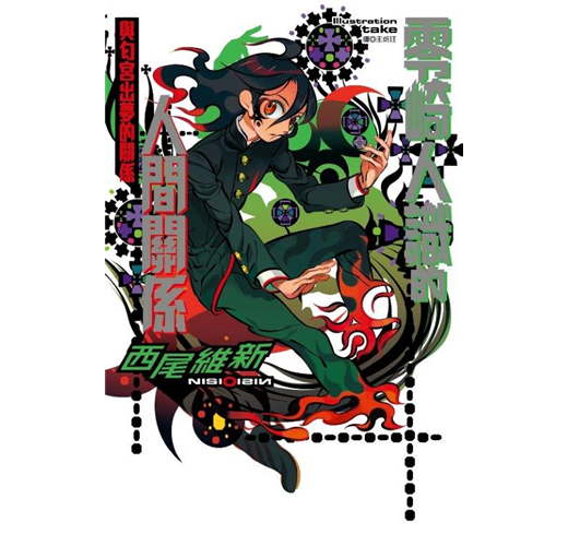 相關著作:《※Double Down—以小博大的勘繰郎》《你我的崩壞世界》《偽物語(上)》《偽物語(下)》《傷物語》《傾物語》《刀語(01)》《刀語(02)》《刀語(03)》《刀語(04)》《刀語(05)》《刀語(06)》《刀語(07)》《刀語(08)》《刀語(09)》《刀語(10)》《刀語(11)》《刀語(12)完》《化物語(上)》《化物語(下)》《囮物語》《完全過激(上)十三階梯》《完全過激(下)藍色學者與戲言玩家》《完全過激(中)紅色制裁vs.橙色種子》《少女不十分》《憑物語》《懸樑高校─戲言跟班的弟子》《戀物語》《斬首循環-藍色學者與戲言跟班》《真庭語(全)》《絕妙邏輯(上)兔吊木垓輔之戲言殺手--小說》《絕妙邏輯(下)石丸小唄之裝神弄鬼--小說》《絞首浪漫派—人間失格.零崎人識(全)--小說》《花物語》《藍氏C型視力環-xxxHOLiC ANOTHERHOLiC》《詭譎質樸的隔絕世界》《貓物語 白(全)》《貓物語 黑(全)》《零崎人識的人間關係 與戲言玩家的關係》《零崎人識的人間關係 與無桐伊織的關係》《零崎人識的人間關係 與零崎雙識的關係》《零崎曲識的人間人間(全)》《零崎軋識的人間敲打(全)》《零崎雙識的人間試驗(全)》《食人魔法(上)─宮兄妹之殺戮奇術》《食人魔法(下)─宮兄妹之殺戮奇術》《鬼物語》