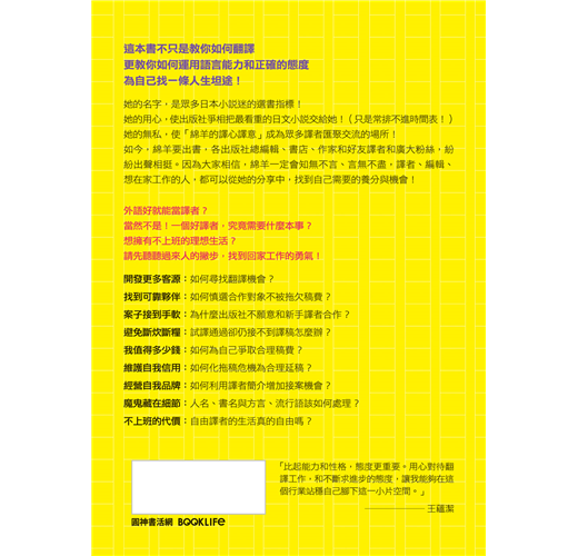 優秀的翻譯能力、傲人的翻譯實績,加上個人的魅力,讓綿羊成為讀者選書依據的「品牌」,這是翻譯業界罕見的現象。當這樣的她,不吝分享翻譯人生的風景點滴,為有志於日文翻譯者備好敲門磚,也讓還在翻譯路上摸索的新人有跡可循而寫出這本書時,想一窺譯界究竟、好奇又求知欲旺盛的讀者們,還等什麼呢?