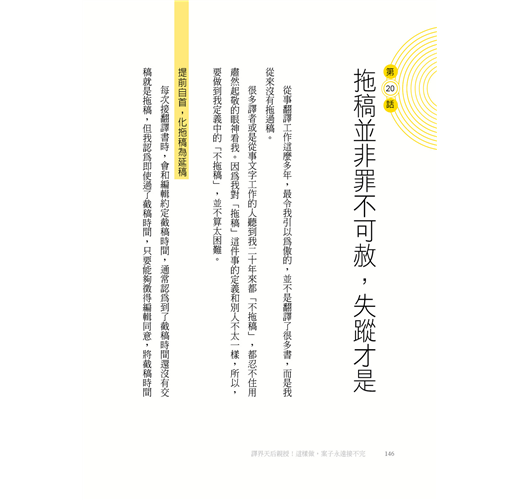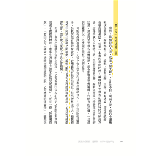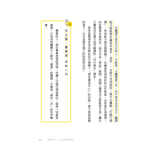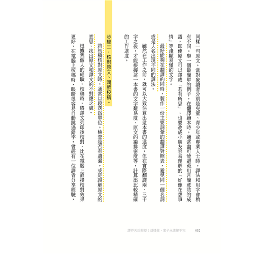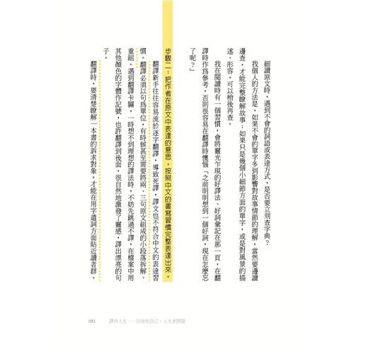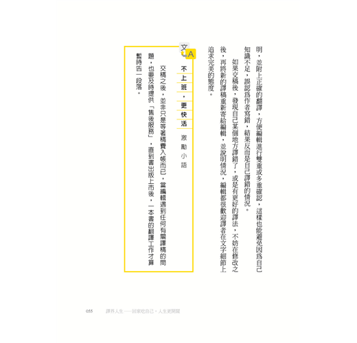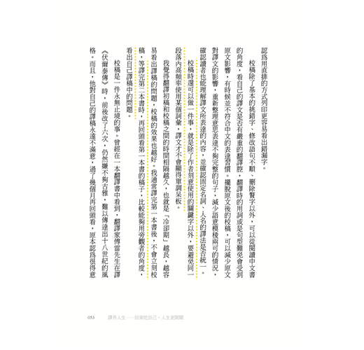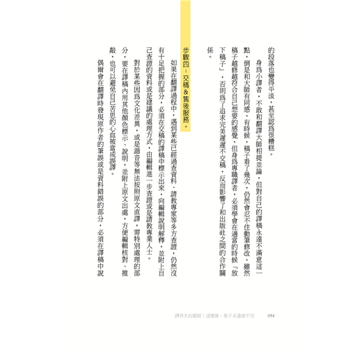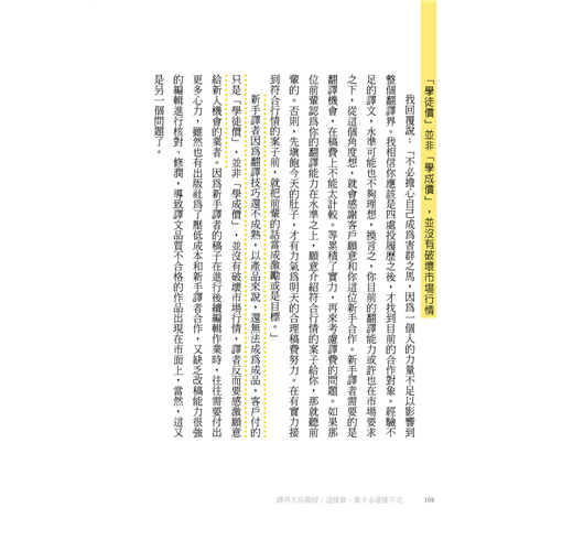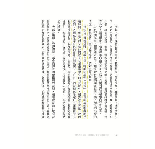 然後,就有了這本書的邀約。年屆百半之際,正在思考是否能夠在退休之前,為想要進入這一行,或是雖然已經入行,但翻譯路走得不太順遂的人做點什麼,所以就有了這本書的誕生。