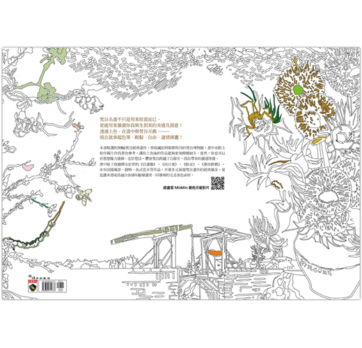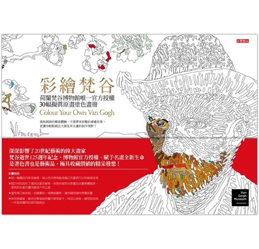 梵谷博物館 Van Gogh Museum 梵谷博物館是全世界擁有最多梵谷畫作館藏的地方,該館的任務是要盡可能地讓世人知道梵谷的生平、作品及其當代之藝術,並讓人們的生活更加豐富,也因此受到鼓舞。為此,梵谷博物館除了有永久館藏、舉辦展覽、出版刊物、以及電影與相關活動外,現在再加上,推出了這本官方授權出版的著色畫冊――《彩繪梵谷》。 2015年是文森.梵谷(Vincent van Gogh)逝世125週年,因此,位於荷蘭阿姆斯特丹的梵谷博物館,以及歐洲許多地方的博物館,都會展覽其收藏的梵谷畫作,以向這位藝術家致敬。 文森.梵谷在27歲決定成為藝術家之前,曾在藝術作品交易公司擔任職員,也從事過老師、書店店員、學生及傳教士等工作。而他成為藝術家的這個決定,也永遠地改變了藝術史。 來自世界各地的人們前往阿姆斯特丹,一睹梵谷畫作的風采,僅僅10年間,梵谷從相對老派的藝術家晉升成為前衛現代藝術家之一,如今,一提到梵谷的畫,便會想起他那明亮且強烈的色彩。 「著色」創造了平靜的時刻,讓人透過創作而感受到完全的放鬆,這是只屬於你的時刻,而且就你一人獨享。「著色」已有所改變,也成為了對大人而言最令人放鬆的活動之一,不再只是屬於小孩子的遊戲。 《彩繪梵谷》收錄了梵谷的30幅作品,將帶你發現梵谷藝術的魔力、色彩的魅力,以及他那令人印象深刻的創造力。