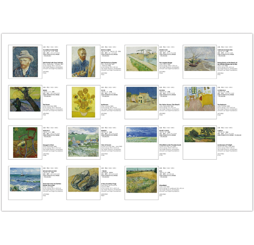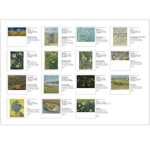 本書選錄的梵谷名畫: 01 梵谷頭戴灰色呢帽自畫像Self-Portrait with Felt Hat (1887) 02 畫家梵谷自畫像Self-Portrait as an Artist (1887) 03 朗格魯瓦吊橋The Langlois Bridge (1888) 04 在聖馬迪拉莫海邊的漁船 Fishing Boats on the Beach at Saintes-Maries-de-la-Mer (1888) 05 播種者 The Sower (1888) 06 向日葵 Sunflowers (1889) 07 黃色房屋 The Yellow House (1888) 08 在阿爾的臥室 The Bedroom (1888) 09 高更的椅子Gauguin ’s Chair (1888) 10 奧維景致 View of Auvers (1890) 11 雷雨雲下的麥田 Wheatfields under Thunderclouds (1890) 12 日暮風光 Landscape at Twilight (1890) 13 聖馬迪拉莫附近的海景The Sea at Les Saintes-Maries-de-la-Mer (1888) 14 一雙皮鞋 A Pair of Leather Clogs (1889) 15 麥田 Wheatfield (1888) 16 麥田群鴉 Wheatfield with Crows (1890) 17 綁乾草的農婦 Peasant Woman Binding Sheaves (after Millet) (1889) 18 盛開的杏樹 Almond Blossom (1890) 19 杯中花 Sprig of Flowering Almond Blossom in a Glass (1888) 20 玫瑰 Roses (1889) 21 蝴蝶和罌粟花 Butterflies and Poppies (1889) 22 皇帝蛾 Giant Peacock Moth (1889) 23 樹幹與樹根 Tree Roots (1890) 24 山丘上的橄欖樹 Olive Trees on a Hillside (1889) 25 阿爾皮勒山的景致 View of the Alpilles (1890) 26 吃馬鈴薯的人 The Potato Eaters (1885) 27 麥田收割豐收 The Harvest (1888) 28 鳶尾花 Irises (1890) 29 盤子上的柑橘 Dish with Citrus Fruit (1887) 30 野玫瑰 Wild roses (1889)