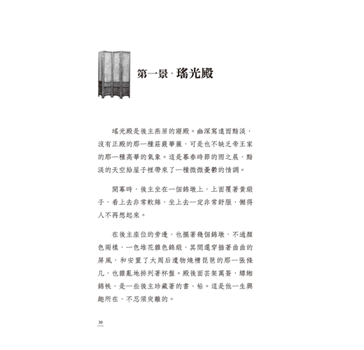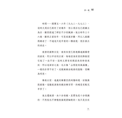 在後主座位的旁邊,也擺著幾個錦墩,不過顏色兩樣,一色堆花雜色錦緞,其間還穿插著曲曲的屏風,和安置了大周后遺物燒槽琵琶的那一張條几,也雜亂地排列著杯盤。殿後面芸架萬簽,縹緗錦帙,是一些後主珍藏著的書、帖。...