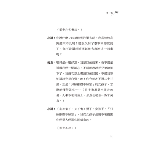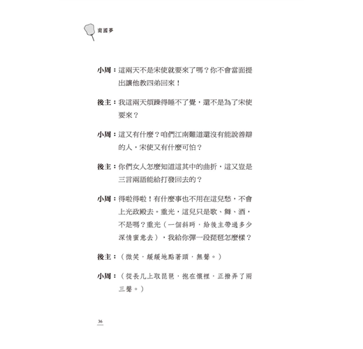 小周:得啦得啦!有什麼事也不用在這兒愁,不會上光政殿去。重光,這兒只是歌、舞、酒,不是嗎?重光(一個斜眄,給後主帶過多少深情蜜意去),我給你彈一段琵琶怎麼樣?