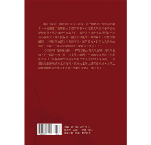 《南國夢》有兩條主線,一條是李後主與大周后和小周后的愛情,另一條是南唐兵敗,後主降宋幽囚。兩條線交叉推進,刻劃後主從日日鶯歌燕舞的風流帝到朝夕以淚洗面的「違命侯」,直至最後悲慘地被宋太宗毒死。沉痛的家國之思貫穿始終,文筆之清麗低婉也有幾許後主遺風,全劇哀傷淒涼,催人淚下。