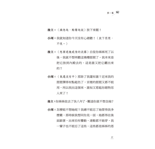 小周:(氣還沒有平)那除了我還有誰?近來我的琵琶彈得有點起色了,宮裡的琵琶又都不能用,所以找出這個來,誰知又惹起你睹物思人來了!