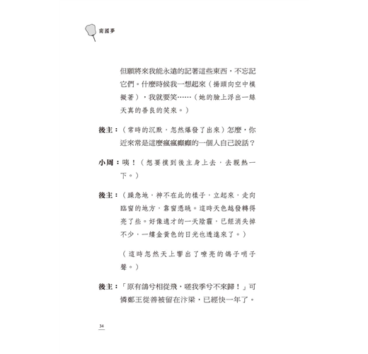 小周:(頑皮地從背後掣出一把黃羅團扇來,一手拿著在面前搖來搖去的,大有諸葛孔明之勢)「風情漸老見春羞,到處消魂感舊遊,多謝長條似相識,強垂煙穗拂人頭。」嘿!這扇子是你寫給誰的?