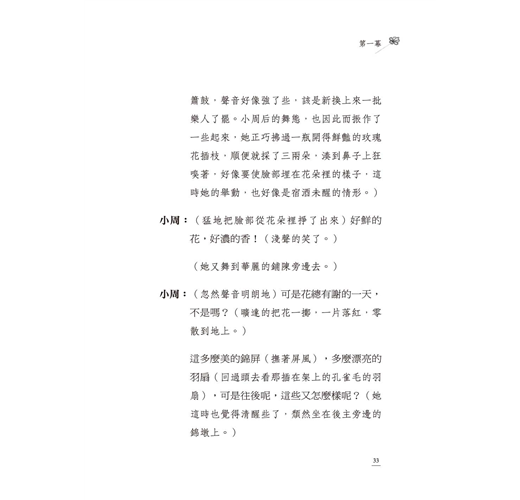 小周:(忽然聲音明朗地)可是花總有謝的一天,不是嗎?(曠達的把花一擲,一片落紅,零散到地上。)
