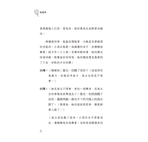 御爐裡的香,氤氳的環繞著,大概是有著醒酒的功能的。小周后拖著一個嬌慵的身子,在懶懶地舞著。她今年二十三歲。音樂時輕時重,她的舞也時急時緩。歌聲曲折的時候,她的腰肢簡直像要倒了下去,好軟的少女的腰!