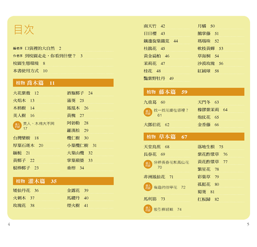 這本小書,蒐集了來自多所校園裡曾經見過的生物,有植物,有動物,它不是校園生物的全部,只是一個小小的觀察記錄。希望透過它,讓我們對於校園中這些每天陪伴著全校師生及教職員工度過無數晨昏的小生命,能有多一點的關注與愛護,學會「和校園生物做朋友」,在每一所校園裡都能譜出和諧的生命樂章。