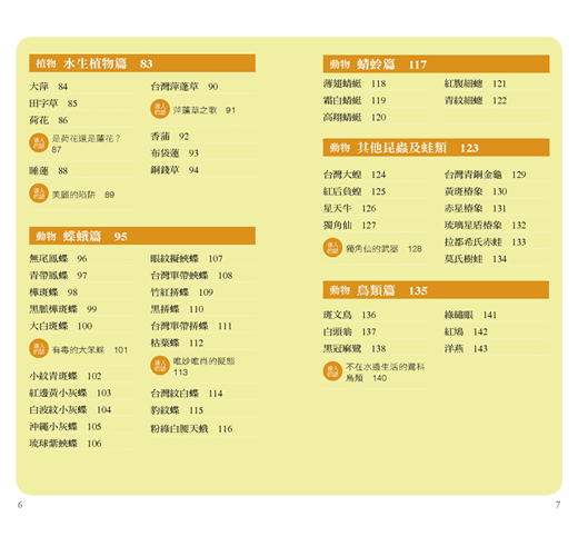 本套書以生態環境或易觀察地區為分冊依據,包括紅樹林、溪流、河口、野塘、珊瑚礁潮間帶、校園、步道植物,也針對許多人喜歡的自然現象,例如將千變萬化的雲編輯成書。