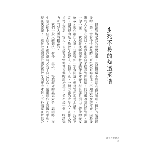 講到管仲,使人聯想到,管仲與齊桓公之間的君臣際遇,與君臣相得之難。這種老闆與伙計之間主從相得的情形,真是一件太不尋常的事。至於齊桓公與管仲、鮑叔牙三個人之間的君臣知遇,以及在朋友情誼上相處得如此盡善盡美,的確難能可貴。尤其管鮑之交的知心知己,更成為千古美談。但也可以說,齊桓公與管鮑之間的相處,表面上固然有君臣的情感,而實際上,似乎還有一份朋友之間的真情感,這尤其是難上加難!我們如果拿後世西洋歷史中,大家所欽佩的德國威廉二世和俾斯麥來比,還不如反觀自己歷